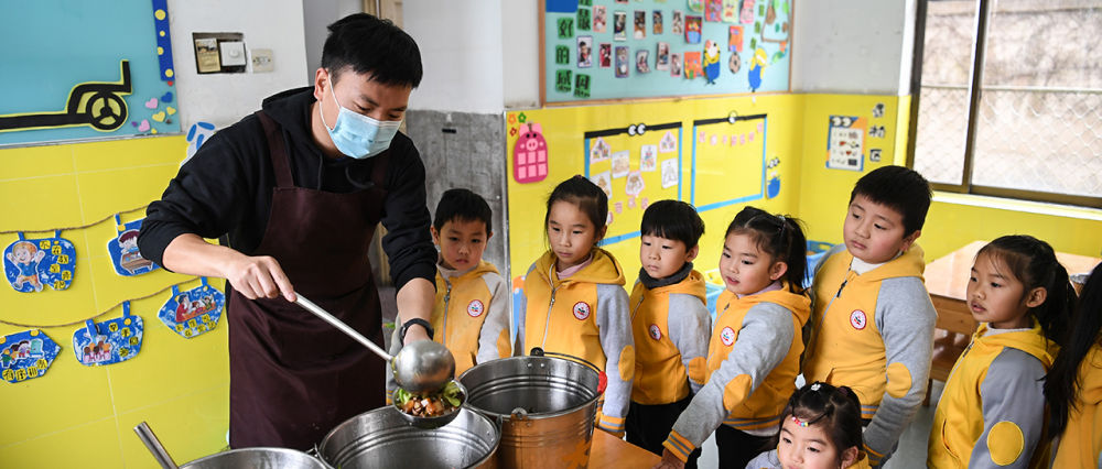 孫浩在合肥鋼鐵集團第一幼兒園為孩子們打飯菜(12月18日攝)。