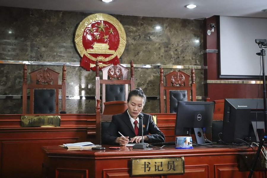 李金蓮在迪慶州中級人民法院法庭上準(zhǔn)備開庭工作(5月7日攝)。新華社發(fā)(肖竹尹攝)