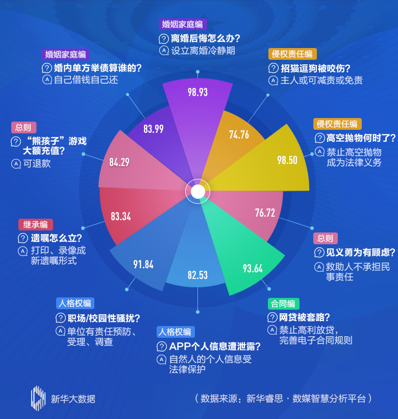 民法典草案1260個(gè)條文中,哪些最受關(guān)注?新華睿思數(shù)據(jù)顯示,最吸引人的話題為“離婚冷靜期”,網(wǎng)絡(luò)熱度值高達(dá)98.93,緊隨其后的,是與百姓日常生活緊密相關(guān)的“高空拋物”和涉及群眾“錢袋子”的“高利放貸”。
