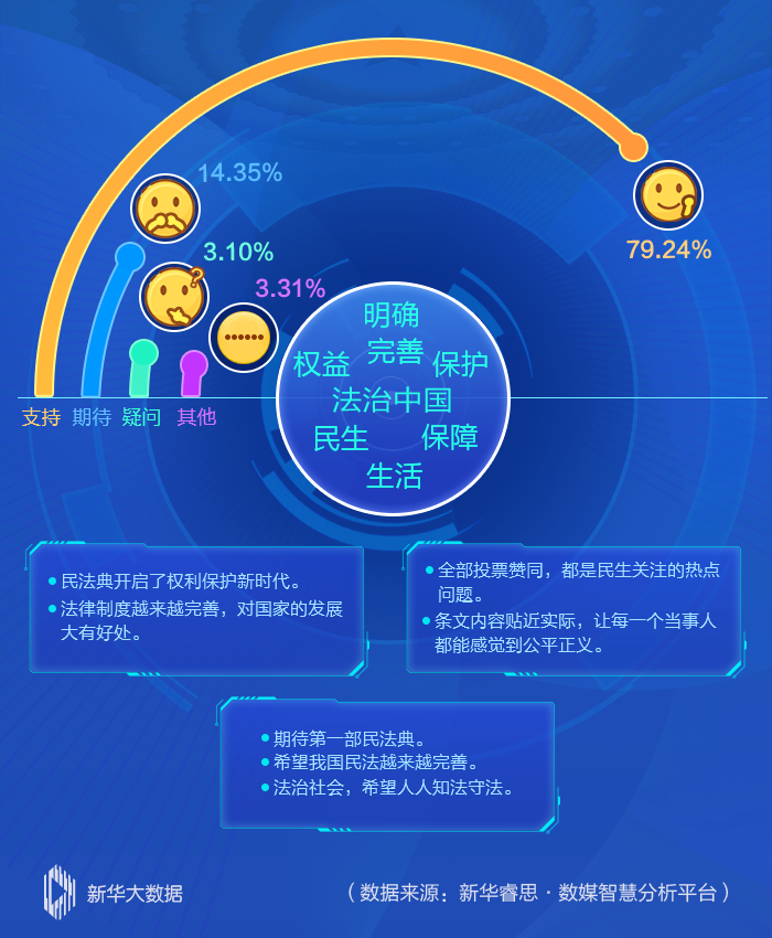新華睿思數(shù)據(jù)顯示,近八成網(wǎng)民對(duì)民法典草案表示支持和肯定,認(rèn)為“民法典開啟了權(quán)利保護(hù)新時(shí)代”“法治中國給老百姓帶來實(shí)實(shí)在在的好處”。從話題熱詞分析來看,“法治中國”“完善”“保護(hù)”三大熱詞有效地呼應(yīng)了編纂民法典的出發(fā)點(diǎn)和落腳點(diǎn)。