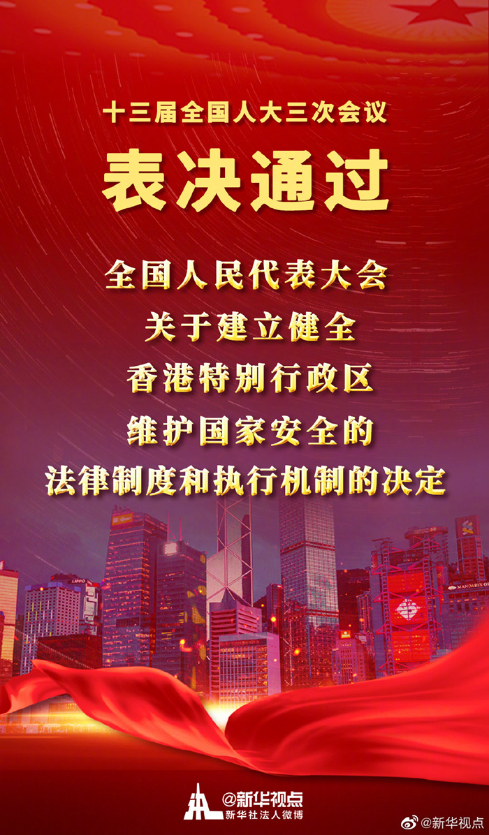 兩會(huì)新華社快訊:十三屆全國(guó)人大三次會(huì)議表決通過(guò)了全國(guó)人民代表大會(huì)關(guān)于建立健全香港特別行政區(qū)維護(hù)國(guó)家安全的法律制度和執(zhí)行機(jī)制的決定。