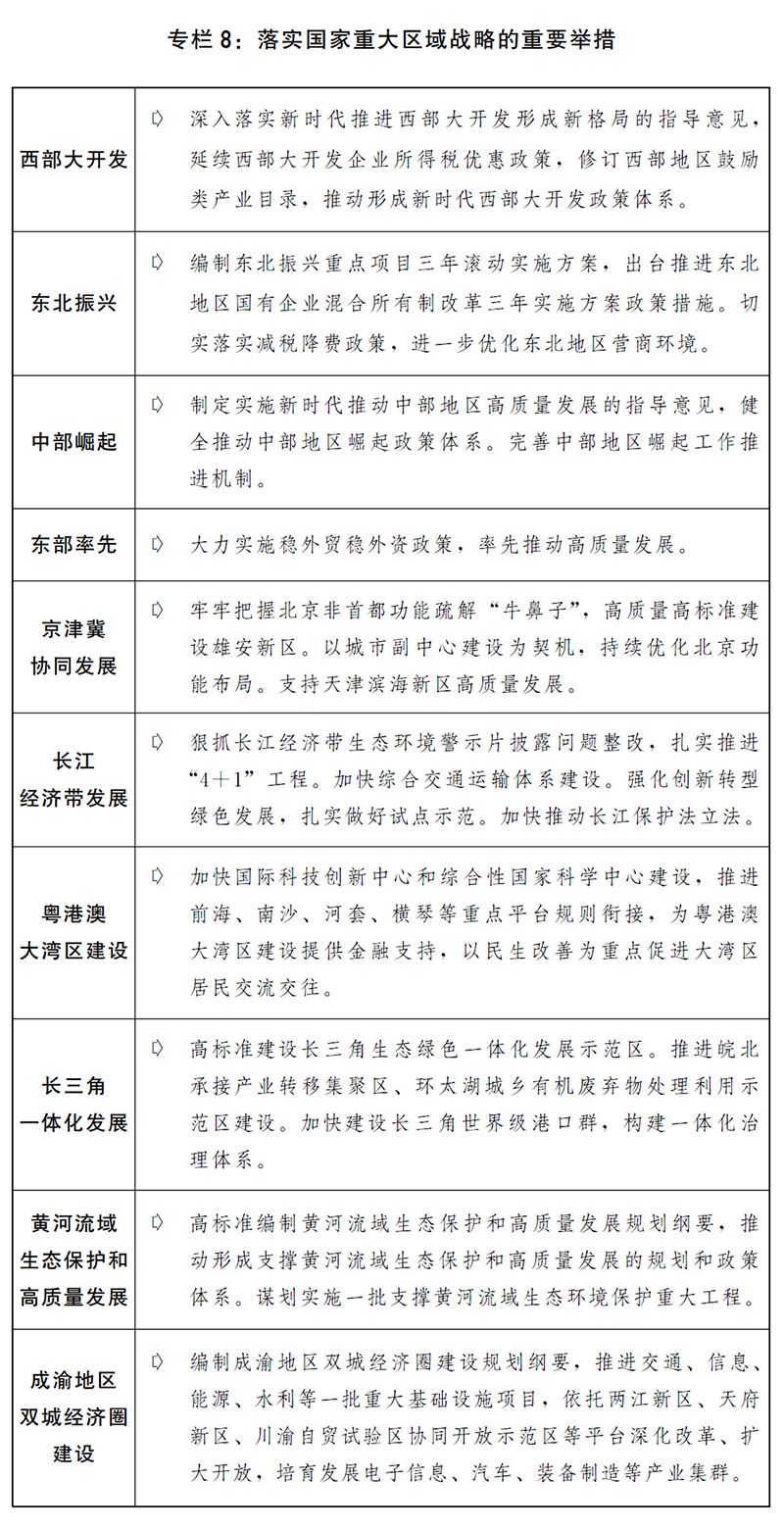 一是落實落細重大區(qū)域發(fā)展戰(zhàn)略。落實區(qū)域協(xié)調發(fā)展新機制,持續(xù)推進西部大開發(fā)形成新格局,支持東北地區(qū)全面振興全方位振興,健全中部地區(qū)崛起政策體系和工作機制,繼續(xù)推動東部地區(qū)率先發(fā)展。縱深推進京津冀協(xié)同發(fā)展,加快實施雄安新區(qū)重點建設項目,完善北京非首都功能疏解政策體系。大力推進長江經濟帶生態(tài)環(huán)境突出問題整改和系統(tǒng)性保護修復,加快構建綜合交通運輸體系,促進內河船舶改造。推動粵港澳大灣區(qū)基礎設施互聯(lián)互通,有序開展國際科技創(chuàng)新中心建設,加快橫琴、河套等重大合作平臺建設。高標準建設長三角生態(tài)綠色一體化示范區(qū),推動長三角交通一體化更高質量發(fā)展,建設虹橋國際開放樞紐。抓緊做好黃河流域生態(tài)保護和高質量發(fā)展規(guī)劃綱要編制和出臺實施工作。大力支持成渝地區(qū)雙城經濟圈建設,打造全國高質量發(fā)展的重要增長極。積極推進西部陸海新通道建設。深化對口支援。支持少數(shù)民族和民族地區(qū)加快發(fā)展。推動國家級新區(qū)、開發(fā)區(qū)等功能平臺創(chuàng)新提升發(fā)展,加快推進資源型地區(qū)經濟轉型和老工業(yè)城市更新改造。推動山西開展能源革命綜合改革試點。繼續(xù)推進承接產業(yè)轉移示范區(qū)建設,在具備條件的內陸城市打造一批高端制造業(yè)基地。制定發(fā)展海洋經濟加快建設海洋強國的意見。完善主體功能區(qū)戰(zhàn)略和制度,編制《全國國土空間規(guī)劃綱要(2021-2035)》。