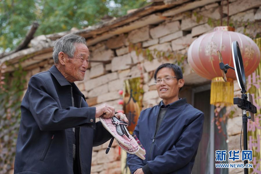 2020年10月28日,河北省沙河市柴關鄉(xiāng)大康村老支書李三平(左)在直播中推介村民手工制作的布鞋。今年年初,李三平在兒子李慶斌直播推介農產品的過程中,應網友的要求加入直播,收獲了眾多網友點贊。在他的努力下,大康村的小米、蜂蜜等貨品銷路越來越廣,慕名前來的游客也更多了。