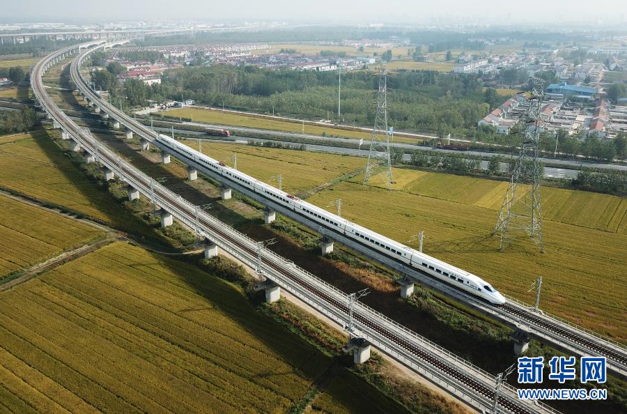 2020年10月10日,一列動(dòng)車組列車行駛在江蘇連云港市境內(nèi)(無(wú)人機(jī)照片)。