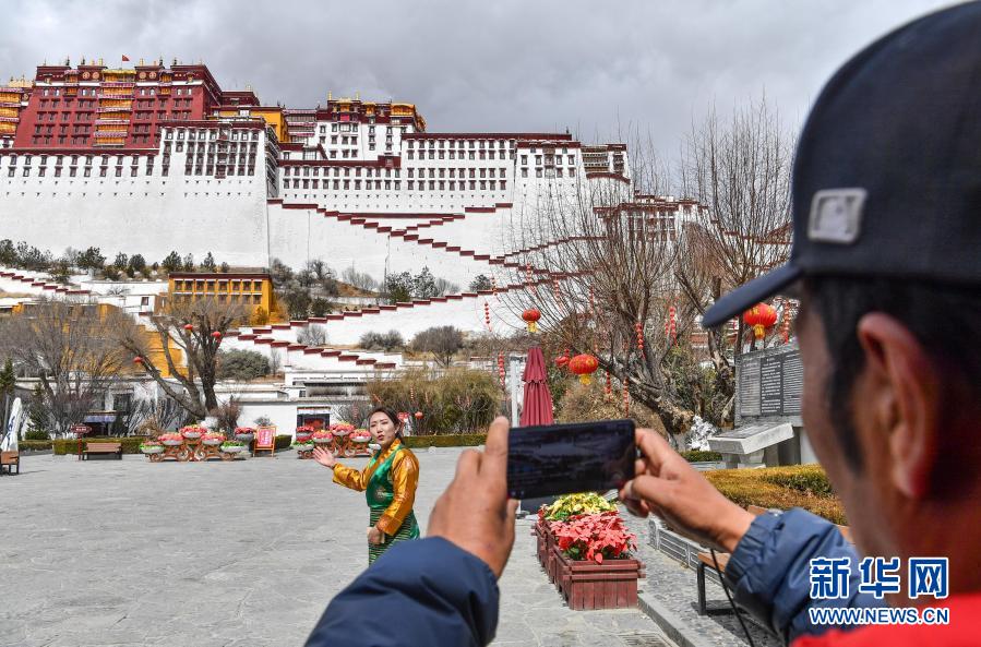 2020年3月1日,西藏布達(dá)拉宮管理處的講解員次仁卓嘎(左)在進(jìn)行直播。