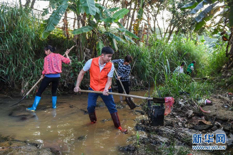 2020年5月2日,廣西興業(yè)縣小平山鎮(zhèn)金華村駐村第一書記董積有(左二)與村民一起清理河道中的淤泥和垃圾。新華社記者 曹祎銘 攝