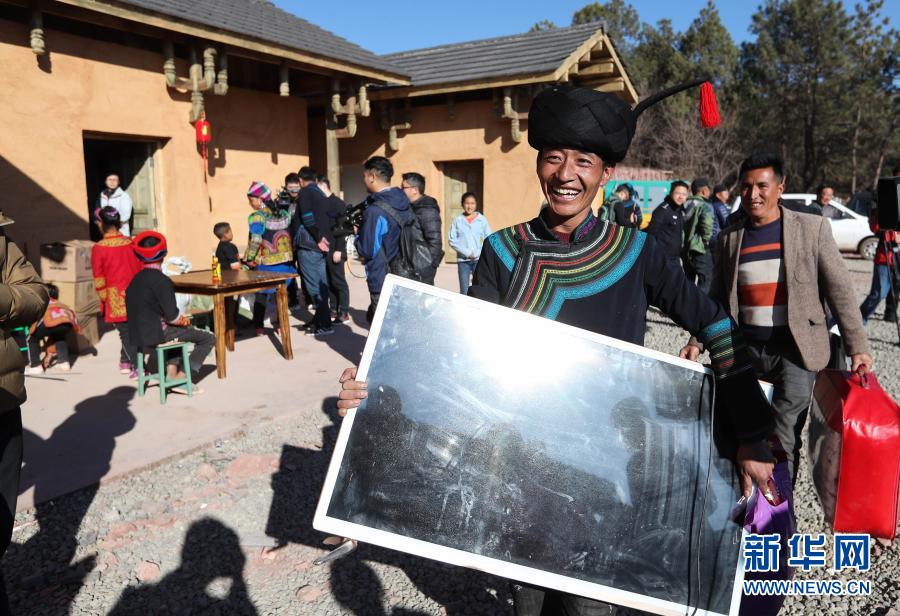 在四川省昭覺縣三河村的易地扶貧安置點(diǎn),彝族群眾馬海日聰喜搬新居(2019年2月11日攝)。2019年2月11日,位于大涼山腹地的四川省昭覺縣三河村首批29戶、168人告別居住多年的土坯房,搬入易地扶貧安置點(diǎn)的新家。新華社記者 江宏景 攝