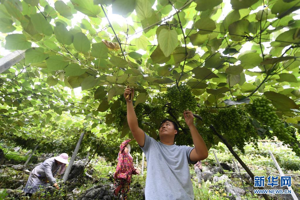 在廣西都安瑤族自治縣下坳鎮(zhèn)隆壩村龍磊屯的毛葡萄示范基地,村民在管護(hù)葡萄(2019年7月24日攝)。新華社記者 陸波岸 攝