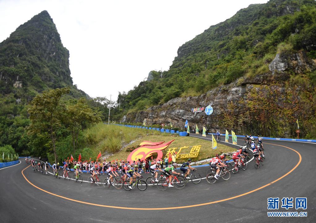 在2017環(huán)廣西公路自行車(chē)世界巡回賽中,參賽選手經(jīng)過(guò)馬山縣古零鎮(zhèn)古零村弄拉屯路段(2017年10月22日攝)。新華社記者 陸波岸 攝
