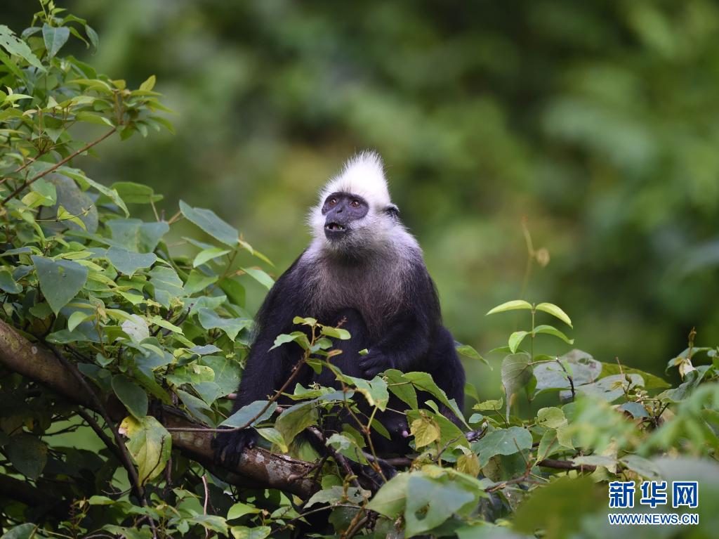廣西崇左白頭葉猴國(guó)家級(jí)自然保護(hù)區(qū)板利片區(qū)一處山坳里,在族群覓食的時(shí)候,猴王警惕地觀察周?chē)h(huán)境(2016年8月6日攝)。新華社記者 周華 攝