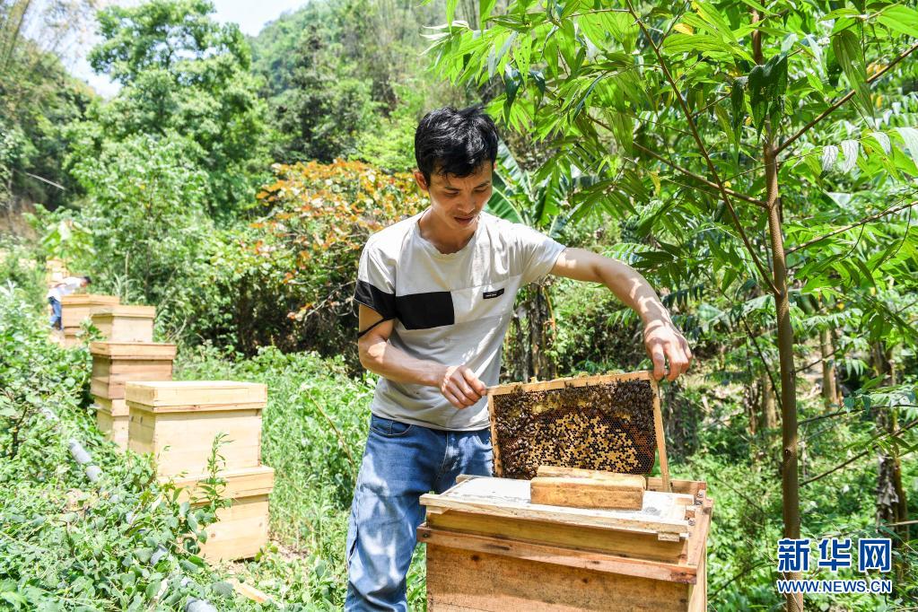 廣西百色市樂(lè)業(yè)縣新化鎮(zhèn)百坭村村民班華六在查看蜂巢(2020年4月20日攝)。新華社記者 曹祎銘 攝