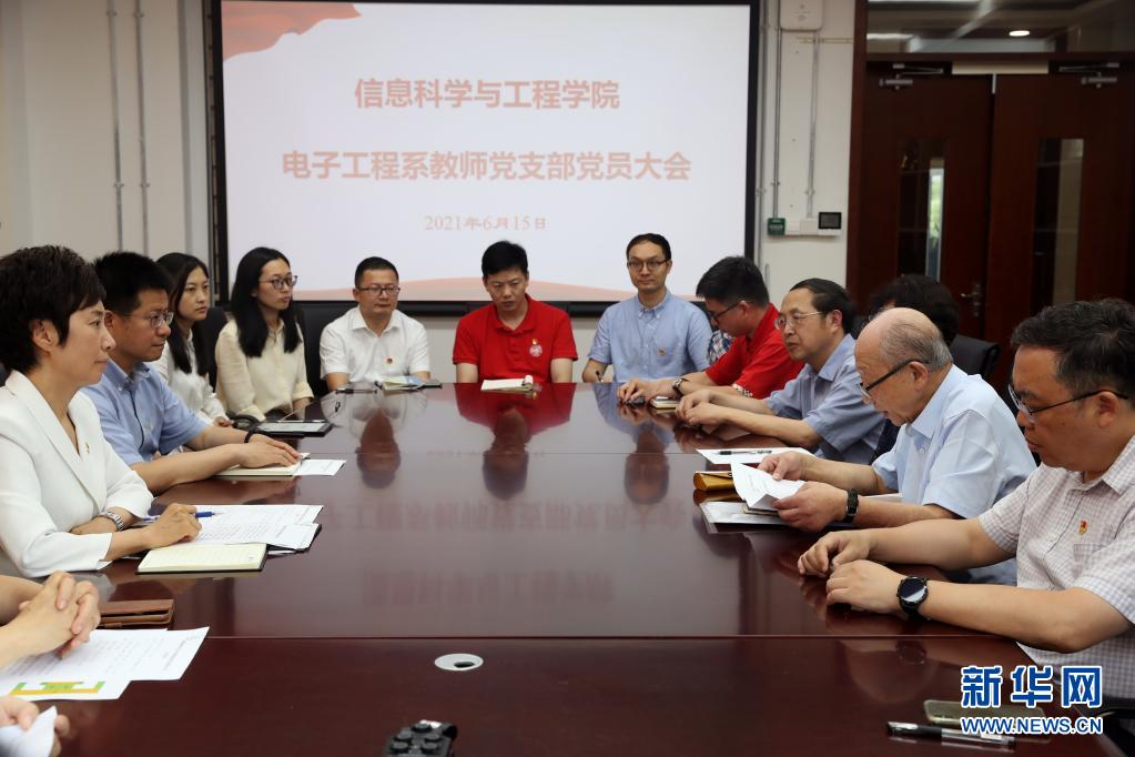 6月15日,在復(fù)旦大學(xué)信息科學(xué)與工程學(xué)院電子工程系教師黨支部黨員大會上,已成為中共預(yù)備黨員的陳振新(左)發(fā)言。新華社記者 劉穎 攝