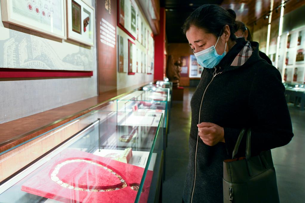 2021年4月3日,在烏魯木齊市革命烈士陵園,瑪依努爾看著愛人艾熱提的獎?wù)孪萑肷钏?。新華社記者 王菲 攝