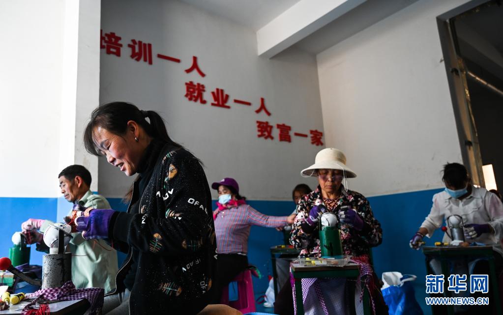 4月26日,搬遷群眾在云南會澤新城搬遷安置點棒球制作車間內(nèi)工作。新華社記者 王冠森 攝