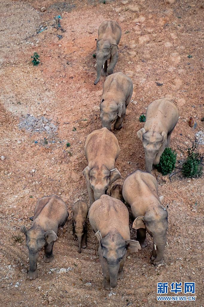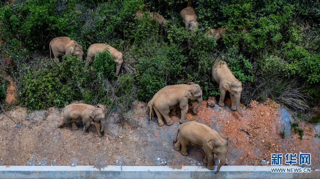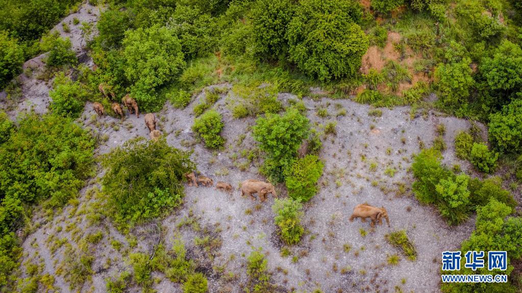這是5月28日在云南省玉溪市峨山縣境內(nèi)拍攝的象群(無人機照片)。新華社記者 胡超 攝