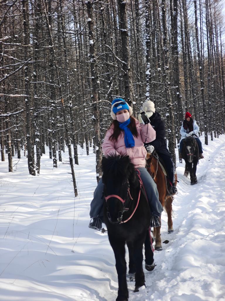在阿尔山市北境马术俱乐部,游客在林海雪原中体验骑行。(张彦波 摄)
