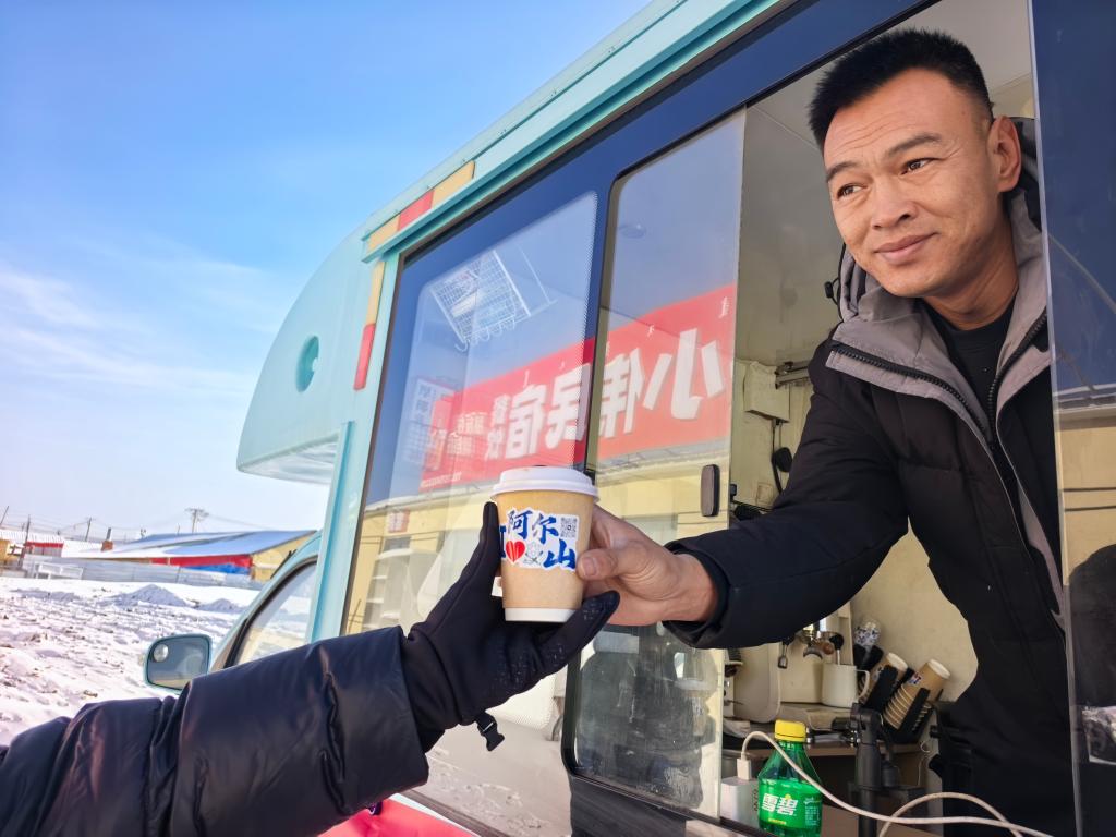 图为游客在潘小伟的咖啡车前购买咖啡。新华社记者恩浩 摄