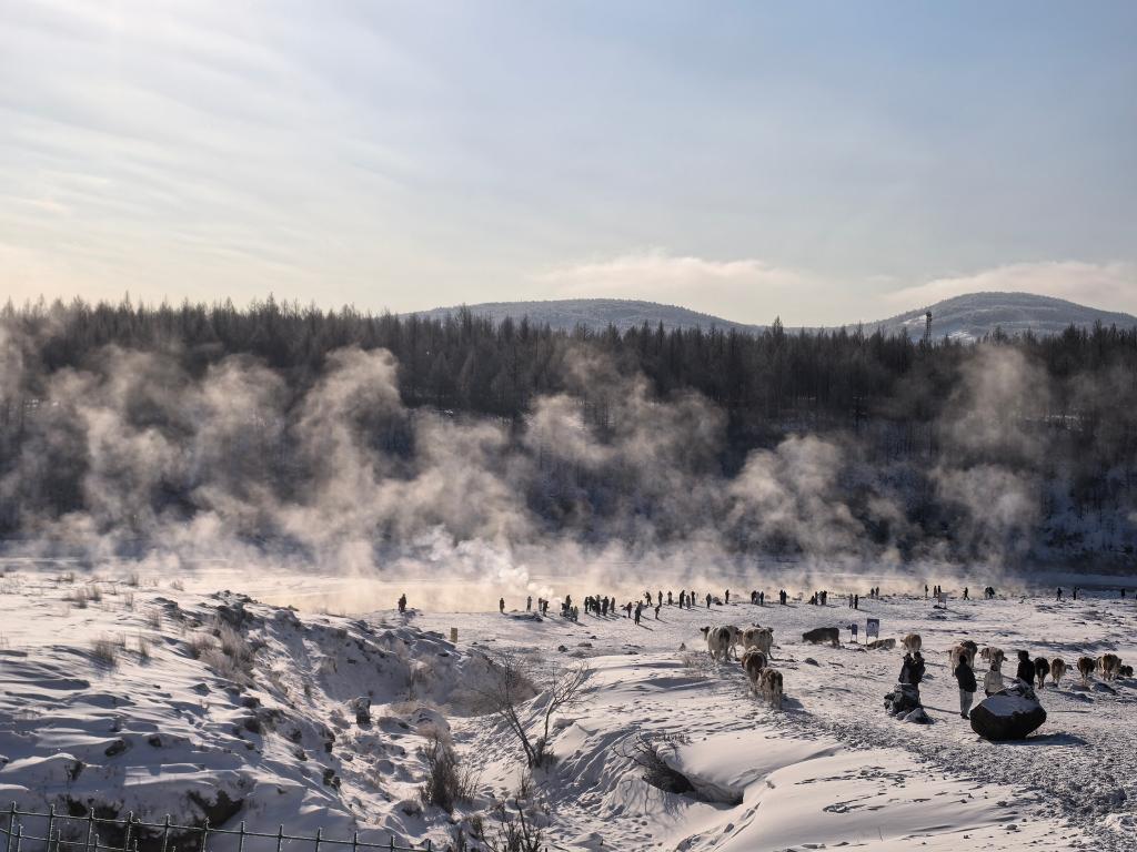 严寒中,不冻河岸边雾凇、氤氲白雾与饮水牛群,仿佛是童话世界里的绝美场景,吸引着游客争相打卡。旅拍摄影师李云生忙得“脚不沾地”,引导游客拍摄 “泼水成冰”、与牛群合影。