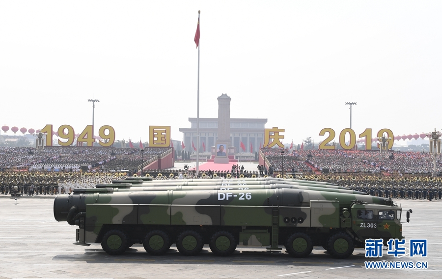 10月1日上午,慶祝中華人民共和國成立70周年大會(huì)在北京天安門廣場隆重舉行。這是東風(fēng)-26核常兼?zhèn)鋵?dǎo)彈方隊(duì)接受檢閱。 新華社記者 高潔 攝