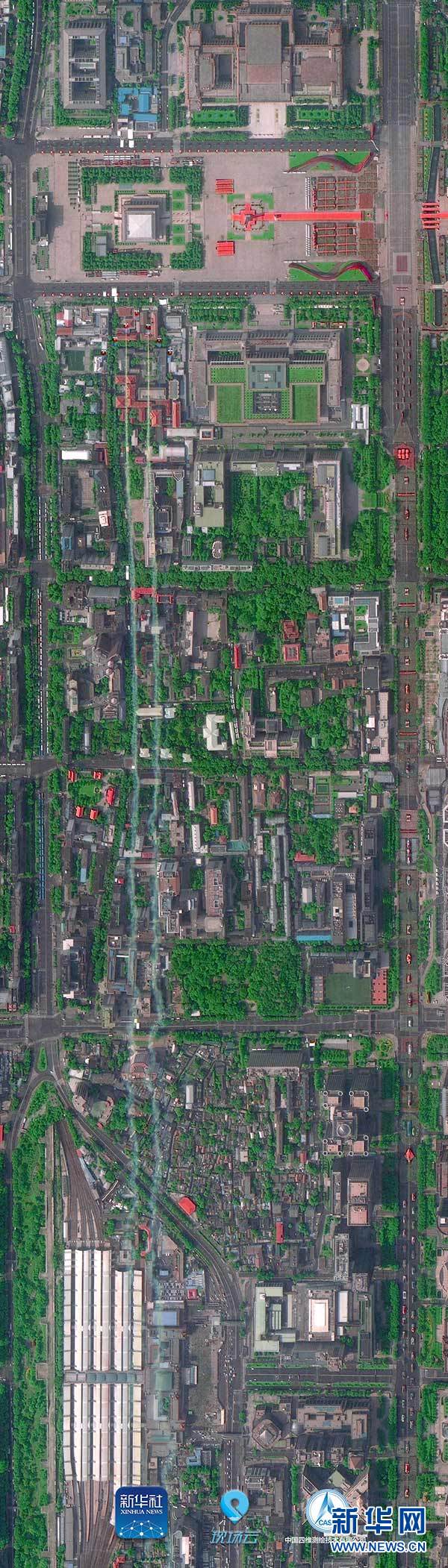 這是“高景1號(hào)”拍攝的拉出彩煙的空中梯隊(duì)即將通過(guò)天安門(mén)廣場(chǎng)上空(10月1日攝)。 10月1日上午,慶祝中華人民共和國(guó)成立70周年大會(huì)在北京天安門(mén)廣場(chǎng)隆重舉行。新華社聯(lián)合多家單位調(diào)用多顆國(guó)產(chǎn)衛(wèi)星俯瞰閱兵,從“最高機(jī)位”發(fā)回這三張珍貴的長(zhǎng)安街全畫(huà)幅衛(wèi)星圖。 新華社發(fā)(中國(guó)四維測(cè)繪技術(shù)有限公司提供)