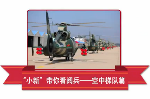 方隊由26架直升機和7架教練機組成。國旗和軍旗分別由1架直升機在正下方懸掛、由2架直升機護(hù)衛(wèi),組成兩組三機梯隊,呈品字形依次通過。緊隨其后的是由20架直升機組成“70”字樣,寓意中華民族以抗戰(zhàn)勝利為起點走向偉大復(fù)興的征程。這是我國在閱兵中首次采用紀(jì)念數(shù)字的編隊飛行。