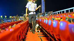 - 在70響禮炮聲中,升旗儀式舉行,全場高唱國歌