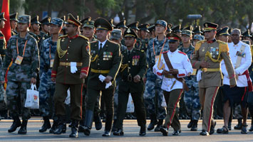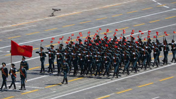 這是我國首次邀請外軍參加閱兵。白俄羅斯、古巴、埃及、哈薩克斯坦、吉爾吉斯斯坦、墨西哥、蒙古國、巴基斯坦、塞爾維亞、塔吉克斯坦、俄羅斯等11國派方隊參閱,每個方隊參閱人數(shù)為75人左右。阿富汗、柬埔寨、斐濟(jì)、老撾、瓦努阿圖、委內(nèi)瑞拉等6國派代表隊參閱,每個代表隊參閱人數(shù)為7人左右。