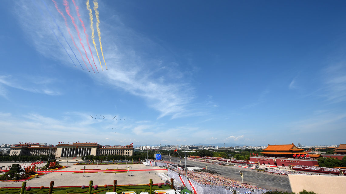 蔚藍(lán)的天空中,6架直升機護(hù)衛(wèi)著國旗和軍旗、20架直升機飛成“70”字樣、7架教練機拉出7道彩煙——率先從天安門廣場飛過的空中護(hù)旗方隊,揭開了勝利日大閱兵的序幕。9月3日,雄偉的天安門,寬闊的長安街,見證著這場大閱兵的一個又一個精彩瞬間。