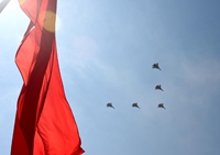 - 空中護(hù)旗方隊率先飛過天安門上空