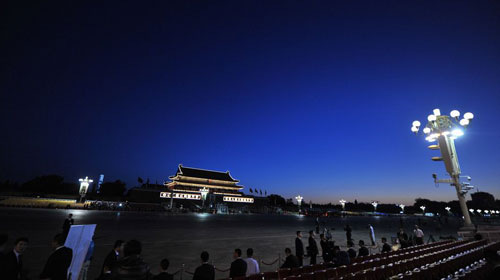 - 李克強、張德江、俞正聲、劉云山、王岐山、張高麗登上城樓,江澤民、胡錦濤登上城樓