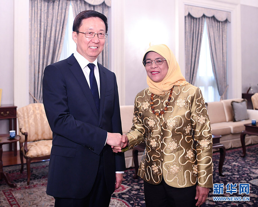 9月19日至21日,中共中央政治局常委、國務(wù)院副總理韓正應(yīng)邀訪問新加坡,分別會(huì)見新加坡總統(tǒng)哈莉瑪、總理李顯龍、副總理張志賢、副總理尚達(dá)曼,并同張志賢共同主持中新雙邊合作聯(lián)委會(huì)第十四次會(huì)議、蘇州工業(yè)園區(qū)聯(lián)合協(xié)調(diào)理事會(huì)第十九次會(huì)議、天津生態(tài)城聯(lián)合協(xié)調(diào)理事會(huì)第十次會(huì)議和中新(重慶)戰(zhàn)略性互聯(lián)互通示范項(xiàng)目聯(lián)合協(xié)調(diào)理事會(huì)第二次會(huì)議。這是9月21日,韓正會(huì)見新加坡總統(tǒng)哈莉瑪。 新華社記者 燕雁 攝