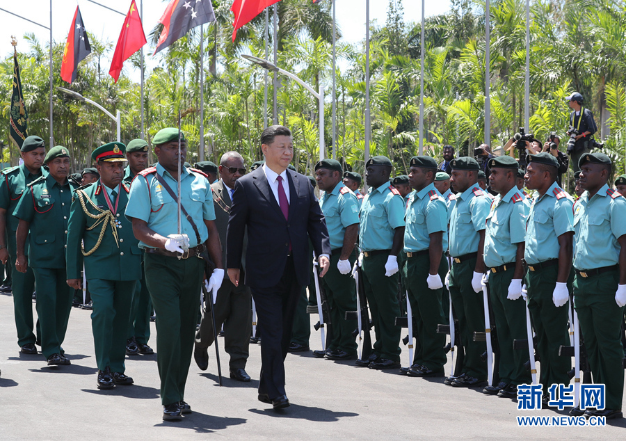 11月16日,國(guó)家主席習(xí)近平在莫爾茲比港會(huì)見(jiàn)巴布亞新幾內(nèi)亞總督達(dá)達(dá)埃。會(huì)見(jiàn)開(kāi)始前,達(dá)達(dá)埃在議會(huì)大廈前廣場(chǎng)為習(xí)近平舉行隆重歡迎儀式。新華社記者 丁林 攝