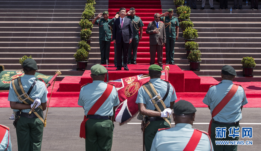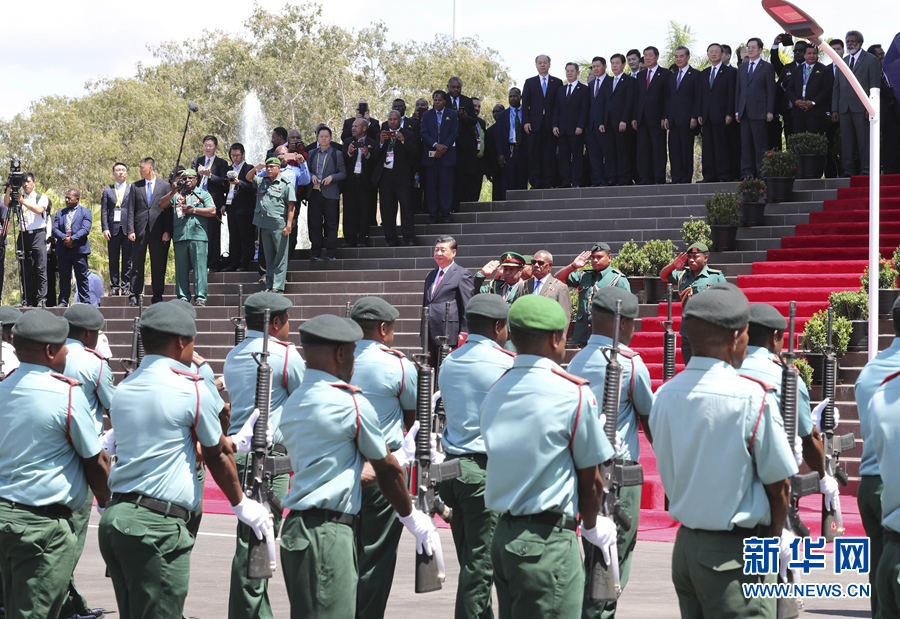 當(dāng)?shù)貢r(shí)間上午10時(shí)30分許,習(xí)近平乘車抵達(dá)議會(huì)大廈,受到達(dá)達(dá)埃熱情迎接。兩國(guó)領(lǐng)導(dǎo)人登上檢閱臺(tái)。軍樂(lè)隊(duì)奏中巴新兩國(guó)國(guó)歌?,F(xiàn)場(chǎng)鳴21響禮炮。習(xí)近平在達(dá)達(dá)埃陪同下檢閱儀仗隊(duì)。檢閱畢,習(xí)近平同巴新方主要官員握手,達(dá)達(dá)埃同中方陪同人員握手。兩國(guó)領(lǐng)導(dǎo)人共同前往議會(huì)大廈會(huì)見(jiàn)廳,巴布亞新幾內(nèi)亞議長(zhǎng)波馬特等在大廈外迎接并陪同會(huì)見(jiàn)。