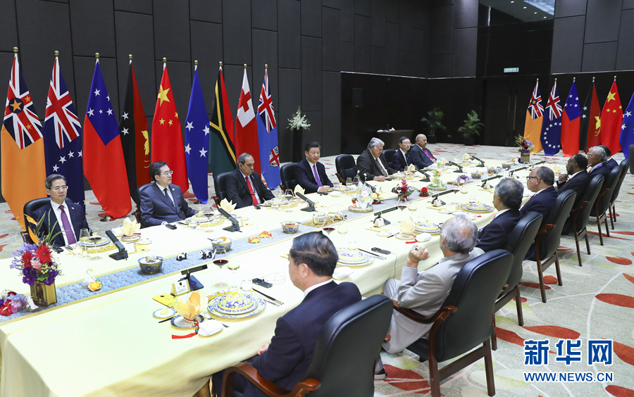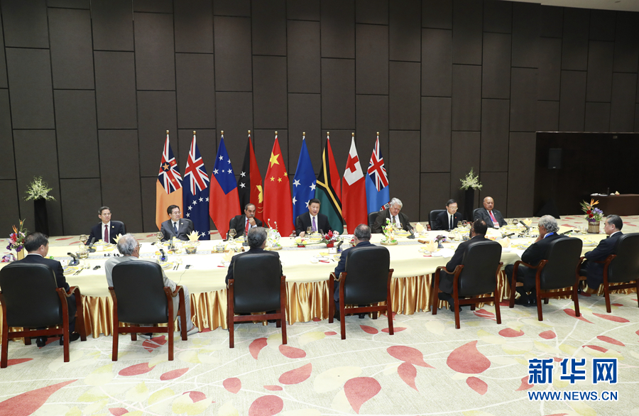 11月16日,國家主席習近平在莫爾茲比港同巴布亞新幾內(nèi)亞總理奧尼爾、密克羅尼西亞聯(lián)邦總統(tǒng)克里斯琴、薩摩亞總理圖伊拉埃帕、瓦努阿圖總理薩爾瓦伊、庫克群島總理普納、湯加首相波希瓦、紐埃總理塔拉吉等建交太平洋島國領(lǐng)導人以及斐濟政府代表、國防部長昆布安博拉舉行集體會晤。習近平主持會晤并發(fā)表主旨講話。 新華社記者 龐興雷 攝