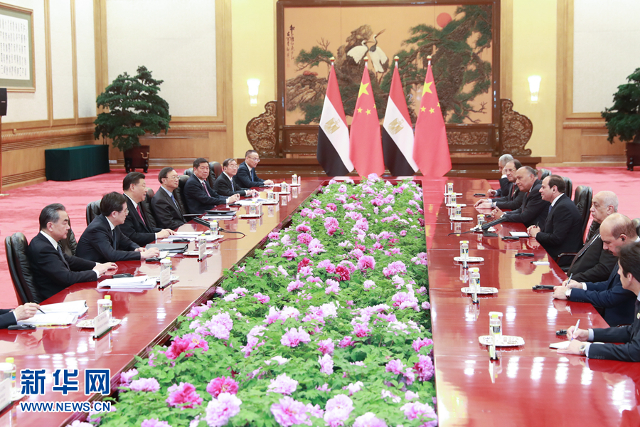 習(xí)近平強(qiáng)調(diào),埃及是非洲聯(lián)盟輪值主席國(guó),總統(tǒng)先生來(lái)華出席第二屆“一帶一路”國(guó)際合作高峰論壇,不僅體現(xiàn)了埃及積極參與共建“一帶一路”的真誠(chéng)意愿,也代表著非洲國(guó)家尋求互利共贏、實(shí)現(xiàn)共同發(fā)展的普遍呼聲。中方高度重視發(fā)展同埃及關(guān)系。雙方要深化政治互信,繼續(xù)在涉及彼此核心利益和重大關(guān)切問(wèn)題上相互支持和配合。中方始終支持埃及探索符合本國(guó)國(guó)情的發(fā)展道路,愿積極參與蘇伊士運(yùn)河走廊開發(fā)計(jì)劃,持續(xù)推進(jìn)蘇伊士經(jīng)貿(mào)合作區(qū)建設(shè)及產(chǎn)能、基礎(chǔ)設(shè)施建設(shè)等領(lǐng)域合作。中方還將在埃及設(shè)立“魯班工坊”,向埃及青年提供職業(yè)技能培訓(xùn)。雙方要深化反恐和安全合作,持續(xù)密切人文交流。中國(guó)感謝非洲人民對(duì)中國(guó)的信任,我們支持非洲和平安全與可持續(xù)發(fā)展倡議和非洲一體化進(jìn)程,愿同埃方加強(qiáng)對(duì)非三方合作,共同促進(jìn)非洲基礎(chǔ)設(shè)施建設(shè)。