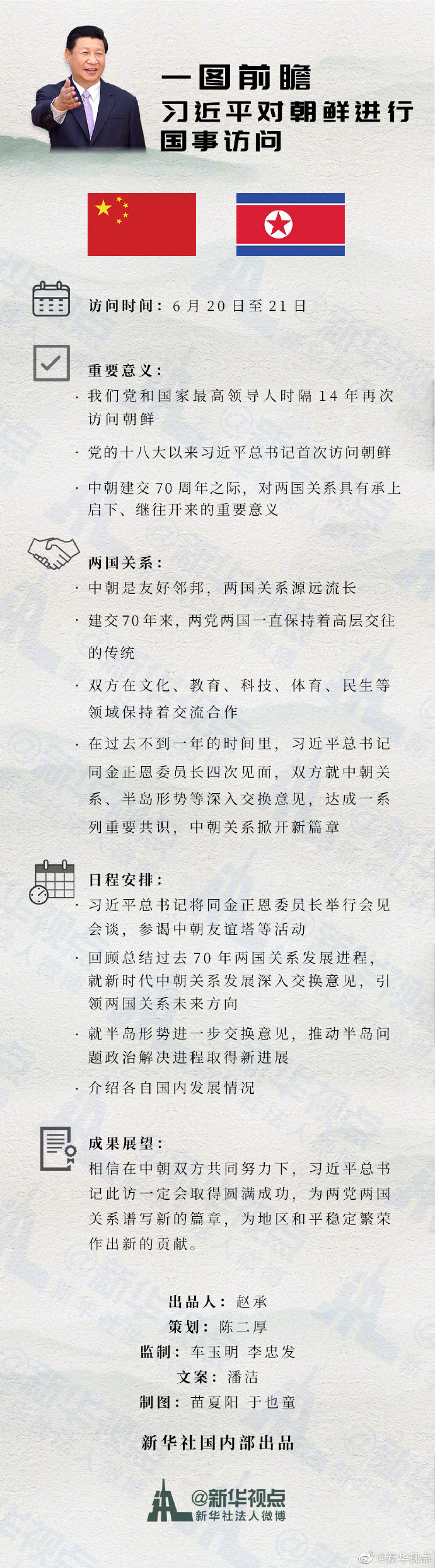 新華社北京6月17日電 中共中央對外聯(lián)絡(luò)部發(fā)言人胡兆明17日在北京宣布:應(yīng)朝鮮勞動黨委員長、朝鮮民主主義人民共和國國務(wù)委員會委員長金正恩邀請,中共中央總書記、中華人民共和國主席習(xí)近平將于6月20日至21日對朝鮮民主主義人民共和國進行國事訪問。