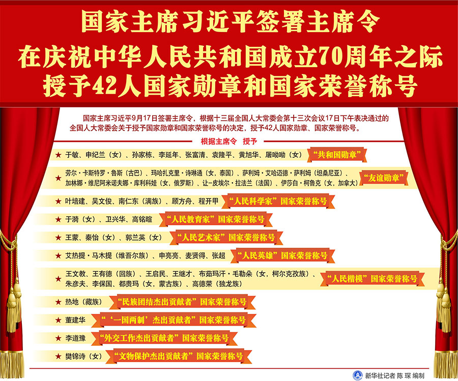 新華社北京9月17日電? 國家主席習近平17日簽署主席令,根據(jù)十三屆全國人大常委會第十三次會議17日下午表決通過的全國人大常委會關于授予國家勛章和國家榮譽稱號的決定,授予42人國家勛章、國家榮譽稱號。
