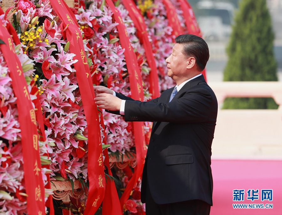 9月30日上午,習(xí)近平、李克強、栗戰(zhàn)書、汪洋、王滬寧、趙樂際、韓正、王岐山等黨和國家領(lǐng)導(dǎo)人來到北京天安門廣場,出席烈士紀(jì)念日向人民英雄敬獻(xiàn)花籃儀式。這是習(xí)近平整理花籃上的緞帶。 新華社記者 龐興雷 攝
