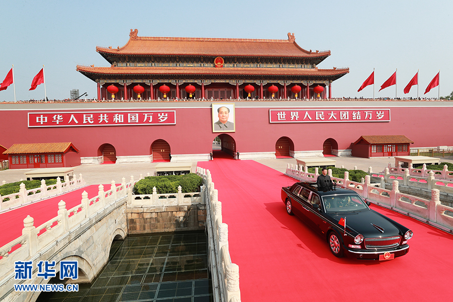 這是習(xí)近平乘坐檢閱車,經(jīng)過(guò)金水橋,駛上長(zhǎng)安街。 新華社記者 龐興雷 攝