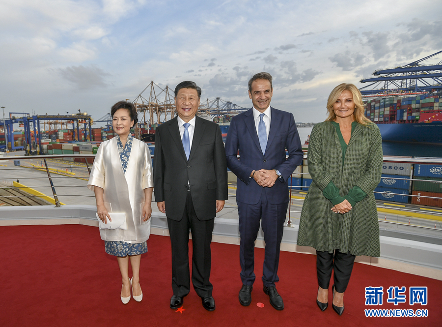 當(dāng)?shù)貢r(shí)間11月11日,國家主席習(xí)近平和夫人彭麗媛在希臘總理米佐塔基斯夫婦陪同下,共同參觀中遠(yuǎn)海運(yùn)比雷埃夫斯港項(xiàng)目。這是習(xí)近平和夫人彭麗媛同米佐塔基斯夫婦在港口樓頂平臺(tái)合影。 新華社記者 謝環(huán)馳 攝