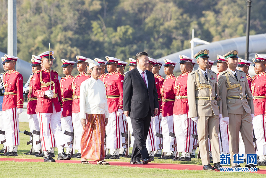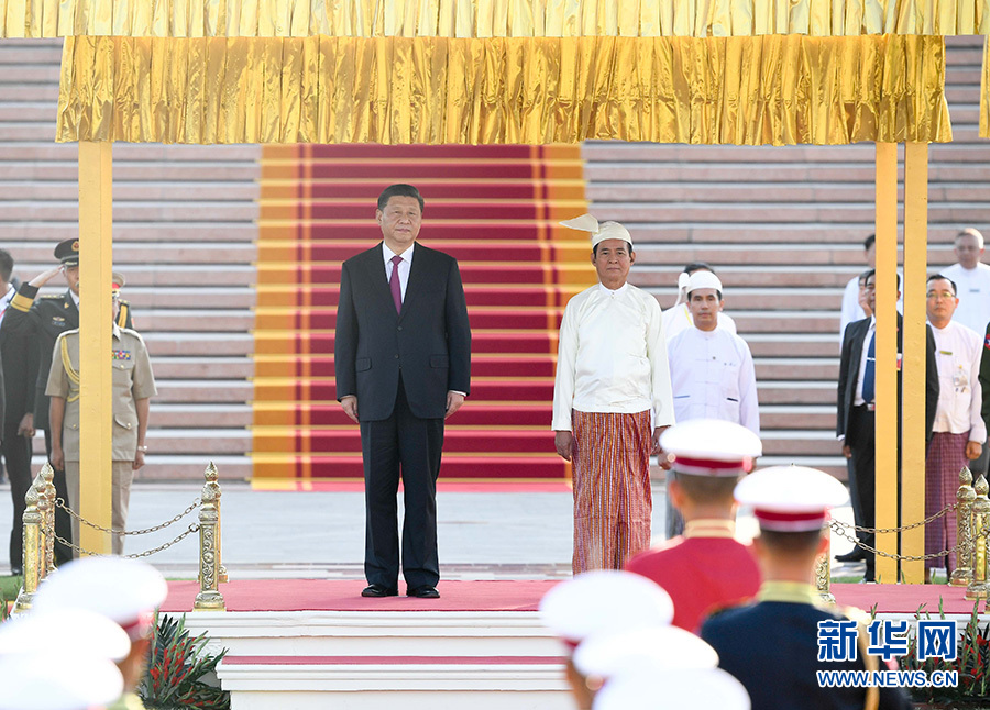 當?shù)貢r間1月17日下午,國家主席習近平在內(nèi)比都總統(tǒng)府出席緬甸總統(tǒng)溫敏舉行的隆重歡迎儀式。 新華社記者 申宏 攝
