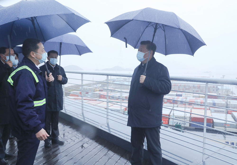 從新華社發(fā)出的現(xiàn)場照片看,總書記在寧波舟山港穿山港區(qū)碼頭上沒有佩戴口罩。↓↓↓