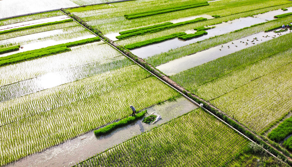 2020年6月14日,農(nóng)民在洛陽市孟津縣會盟鎮(zhèn)黃河岸邊的萬畝優(yōu)質水稻種植示范基地內(nèi)移栽水稻秧苗(無人機照片)。新華社發(fā)(黃政偉 攝)