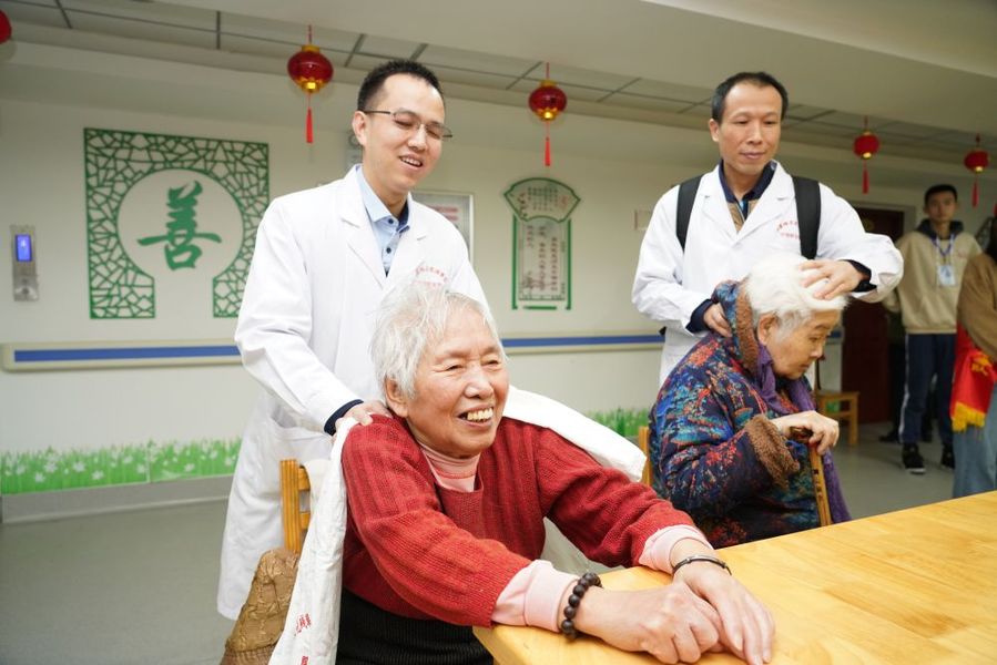 三明市盲協(xié)主席江華帶領(lǐng)盲人志愿團隊為社區(qū)老人按摩推拿。周志鴻 攝