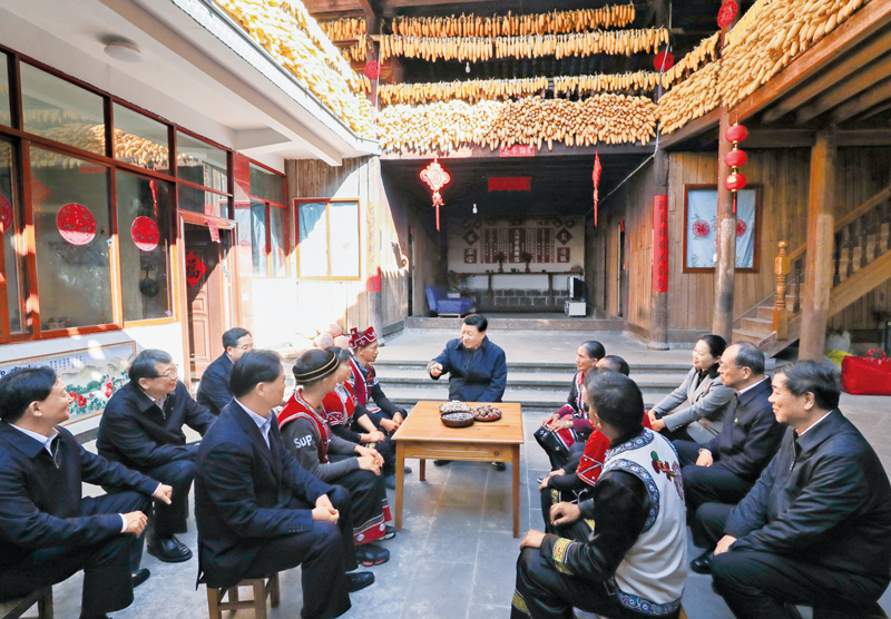 2021年2月3日至5日,中共中央總書記、國家主席、中央軍委主席習(xí)近平來到貴州考察調(diào)研,看望慰問各族干部群眾,向全國各族人民致以美好的新春祝福。這是3日下午,習(xí)近平在畢節(jié)市黔西縣新仁苗族鄉(xiāng)化屋村文化廣場上,向全國各族人民、港澳臺(tái)同胞和海外僑胞拜年。 新華社記者 謝環(huán)馳/攝