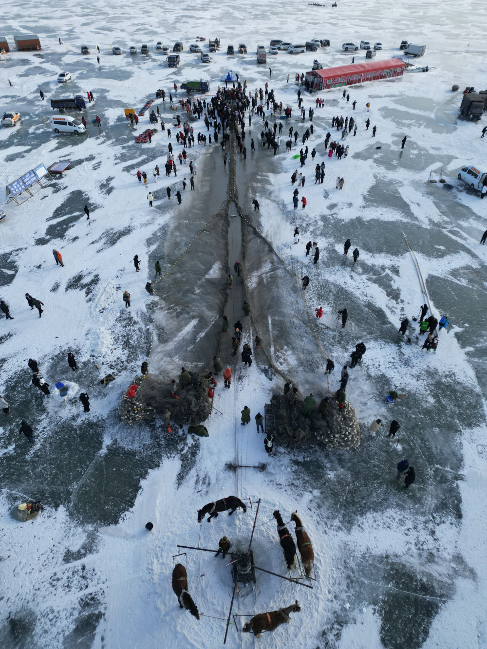 在吉林省松原市,游客在查干湖冰面上观看冬捕(2026年1月7日摄,无人机照片)。新华社记者 颜麟蕴 摄