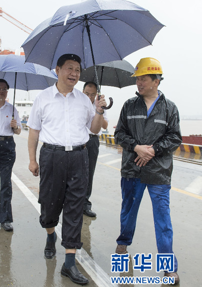 2013年7月21日至23日,中共中央總書(shū)記、國(guó)家主席、中央軍委主席習(xí)近平在湖北調(diào)研全面深化改革問(wèn)題和當(dāng)前經(jīng)濟(jì)運(yùn)行情況。 21日上午,習(xí)近平冒雨來(lái)到武漢新港陽(yáng)邏集裝箱港區(qū)考察。 新華社記者 李學(xué)仁 攝