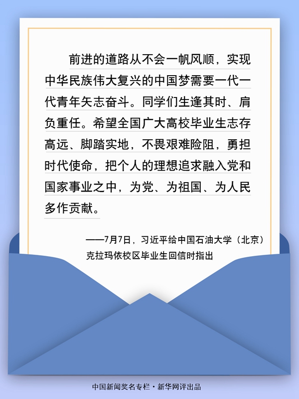 近日,中國(guó)石油大學(xué)(北京)克拉瑪依校區(qū)的118名畢業(yè)生給習(xí)近平總書(shū)記寫(xiě)信,匯報(bào)了大學(xué)四年學(xué)習(xí)和思想上的收獲,表達(dá)了扎根西部、建設(shè)邊疆的堅(jiān)強(qiáng)決心??倳?shū)記回信肯定他們到邊疆基層工作的選擇,并對(duì)廣大高校畢業(yè)生提出殷切期望。