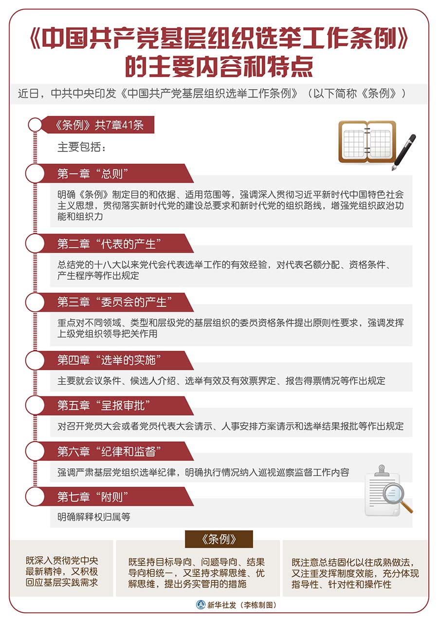 《條例》堅(jiān)持以習(xí)近平新時(shí)代中國(guó)特色社會(huì)主義思想為指導(dǎo),以黨章為根本遵循,深入貫徹黨的十九大和十九屆二中、三中、四中全會(huì)精神,貫徹落實(shí)新時(shí)代黨的建設(shè)總要求和新時(shí)代黨的組織路線,是新時(shí)代基層黨組織選舉工作的基本遵循。《條例》的制定和實(shí)施,對(duì)于發(fā)揚(yáng)黨內(nèi)民主、尊重和保障黨員民主權(quán)利、規(guī)范基層黨組織選舉,增強(qiáng)基層黨組織政治功能和組織力,把基層黨組織建設(shè)成為宣傳黨的主張、貫徹黨的決定、領(lǐng)導(dǎo)基層治理、團(tuán)結(jié)動(dòng)員群眾、推動(dòng)改革發(fā)展的堅(jiān)強(qiáng)戰(zhàn)斗堡壘,鞏固黨長(zhǎng)期執(zhí)政的組織基礎(chǔ),具有重要意義。