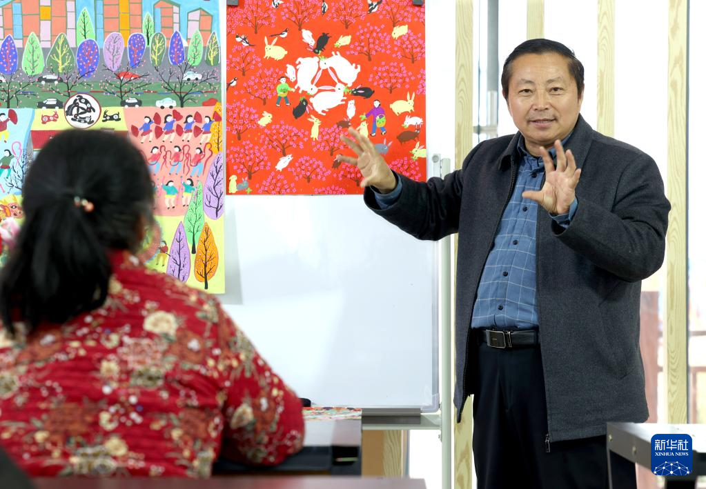 3月21日,当地农民画家潘宇的妻子徐玉兄(右)指导绣娘刺绣。